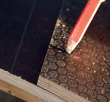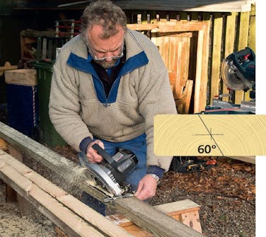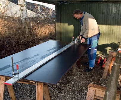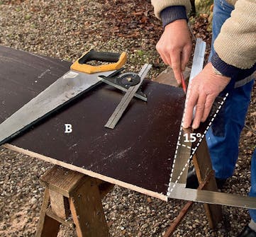 Lägg den ena kortsidan på bockarna och markera två sågspår i 15 graders vinkel från kortändarna. När du har sågat kortsidan för hand eller med cirkelsåg, använder du den som mall för de tre andra sidorna.