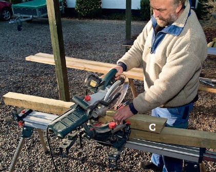 Hörnstolparna (C) sågas 43 cm långa innan du ställer in kapsågen på dubbelgering, 15 grader. Därefter fortsätter du med kapning två gånger av ändarna. Mittenstolparna (D) ska geringssågas på vanligt sätt i 15 grader i ändarna.