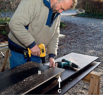 Kortsidorna (B) skruvas fast på hörnstolparna (C): det är bäst att förborra och försänka för skruvhuvudena, för annars kan de inte försänkas i den hårda skivan. Vi fäster 5 rostfria skruvar, 5 x 50 mm, förskjutna i varje hörn.