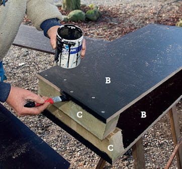Samtliga kanter på plywooden förseglas med färg innan lådan skruvas ihop. På så sätt undviker vi att det tränger in fukt i plywooden.