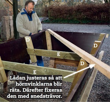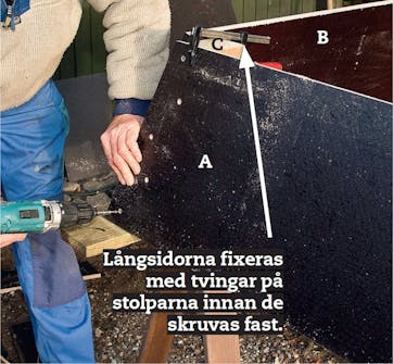 Långsidorna (A) skruvas nu fast på hörnstolparna. Vi har nu vänt lådan upp och ned på bockarna, som vi har gjort bredare än långa brädor på ovansidan. Då får den 120 cm breda lådan stöd och ligger stadigt.