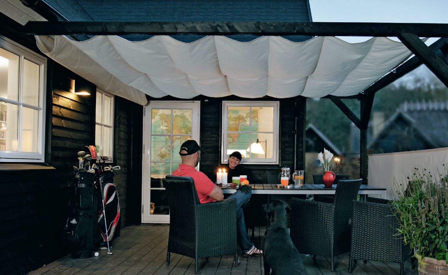 En pergola inlindad i klätterväxter, en segelduk som dras ut när det behövs, ett fast tak av glas eller brädor - alla tak kan ge dig flera timmar på terrassen eftersom de ger skugga när solen steker, ger lä för regn och dagg och håller kvar värmen när solen har gått ner. Här ser du en segelduk som hänger i vajrar över terrassen. Den kan lätt dras fram när det behövs.