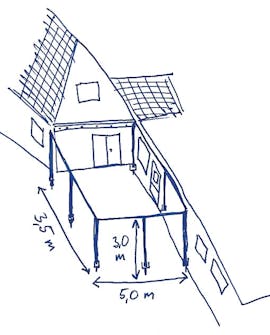 Att be om goda råd i byggvaruhuset där allt material köps. Konstruktionen skall vila på sex stolpar. En kraftig bjälke skruvas fast på tegelväggen och därefter görs ett tak som kan vila på stolpar och bjälke. Som tak väljs korrugerad plast. Stuprör sätts upp. Eventuella problem löses i takt med att de uppstår.