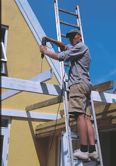 Vi skruvar först fast en bärlina på tegelgaveln och denna bjälke kommer att bära takreglarna. Det är viktigt att använda plastpluggar och inte expansionsbultar av stål i tegelväggen.