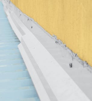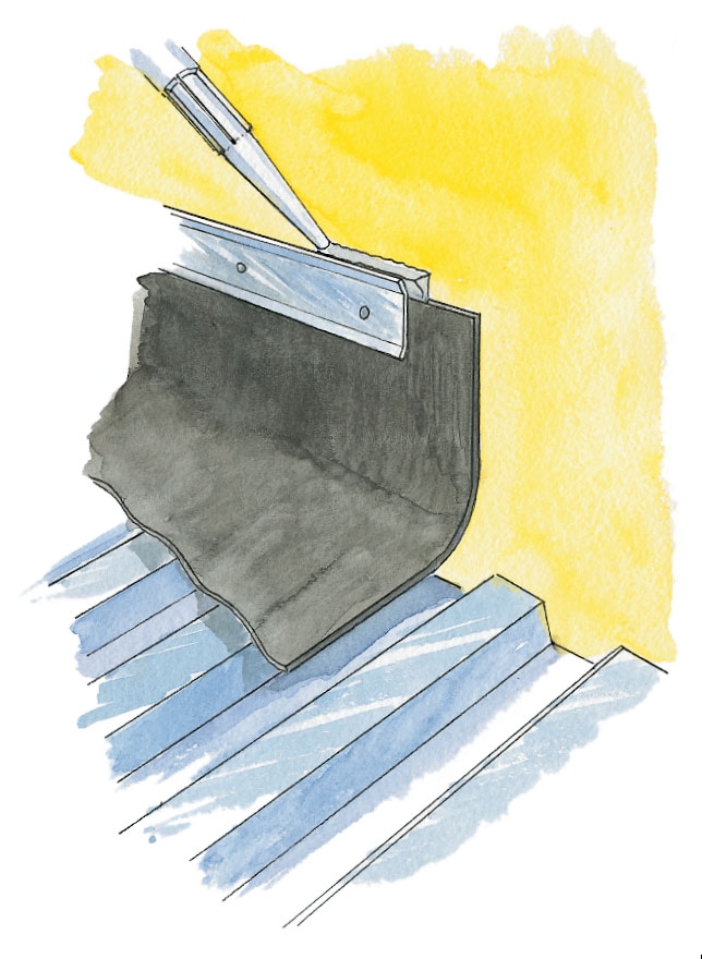 En aluminiumlist monteras på tegelgaveln för att det inte skall kunna regna in. Listen tätas med fogmassa för att det inte skall kunna rinna vatten längs väggen och in under taket.