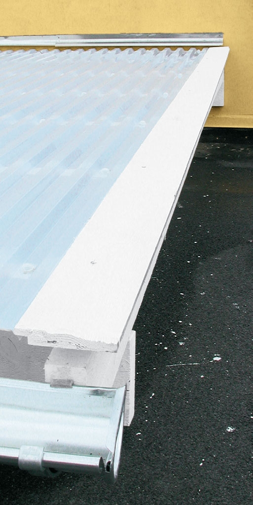 Takfotsbrädorna på den låga byggnaden förstärks så att terrasstaket kan vila direkt på dessa brädor. Sidobyggnadens hängränna sitter precis nedanför och därför är det inte möjligt att skruva fast reglar på de utstickande takreglarna. Det är inte heller särskilt förnuftigt att försöka förlänga takreglarna, så därför är det bäst att lägga taket lite högre upp.