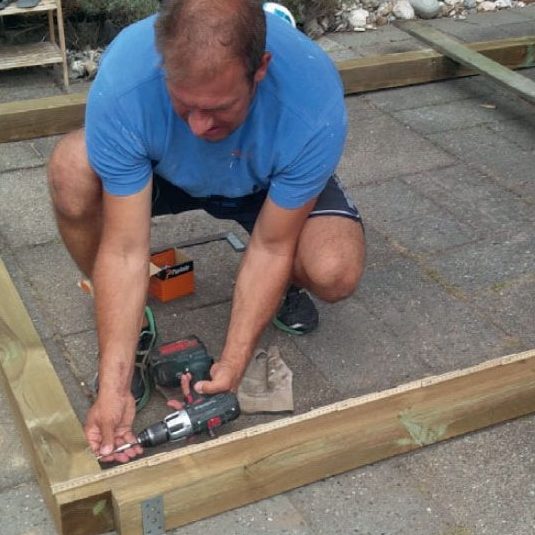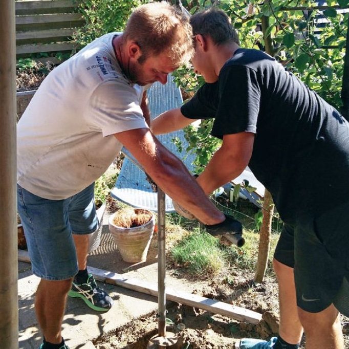 Gör hål för stolparna (A), när du har mätt upp var de ska placeras. Hålen borras enklast med en jordborr - och en medhjälpare! Hålen ska vara minst 90 cm djupa (frostfritt) och vara rymliga så att stolparna kan justeras på plats.