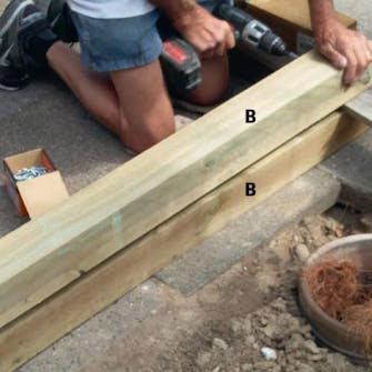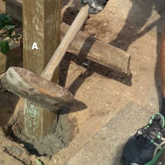 Stolpar (A) och hammarband (B) fogas ihop, två tillsammans, innan stolparna reses upp och placeras i hålen. När hammarbandet är fast, är det lättare att ha exakt samma avstånd mellan stolparna.