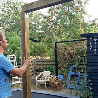 Placera nu de två stolpstommarna i hålen. Stolparna placeras så att de står helt rakt. Kolla med vattenpasset på båda sidor om stolparna. Stommen stagas upp så att stolparna står i rätt höjd. Här ska hammarbandet placeras 10 cm under bärlinan vid huset, så att taket får en lämplig lutning.