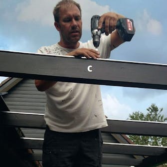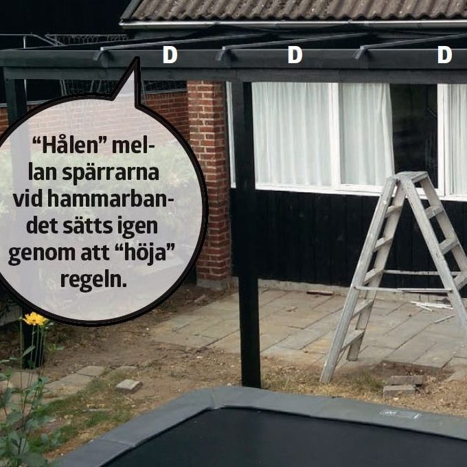 Mellan spärrarna (C) täpps igen med reglar (D). De kapas på längden så att de passar mellan två spärrar. Reglarna fästs med vinkeljärn och ankarskruv. Därefter målas trästommen. Det är lättare att göra det nu, innan takskivorna sätts på plats, så att du kan komma till lätt och inte riskerar att få färg på taket. Och det är en bra investering, för träskydd förlänger träets livslängd, så att du får glädje av din överbyggnad i många år.