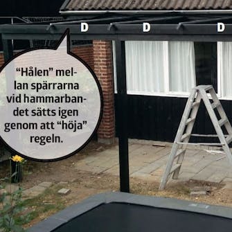Kolla en extra gång så att stolparna (A) står helt rakt innan du fäster spärrarna (C) vid hammarbandet (B). Därför ska du sätta spärrarna samma dag som stolparna, så att betongen inte hinner härda. Du ska också kolla en gång extra så att alla spärrarna sitter vinkelrätt mot hammarbandet med exakt samma avstånd mellan sig, eftersom takskivorna ska fästas på lister som skruvas fast i spärrarna.