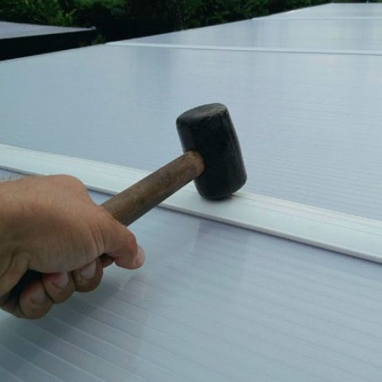 Takskivorna sätts ovanpå takspärrarna, där de ska fästas i en skena ovanpå en gummilist. Börja med att täta vid huset, rulla ut gummilister över spärrarna och sätta fast expansionsband på hammarbandet. Alla delar till taket ska köpas tillsammans av samma tillverkare, så att de passar ihop.