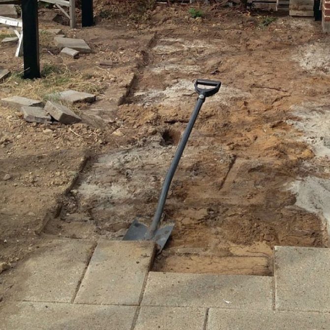 De gamla stenarna tas bort. Även det översta lagret av det gamla underlaget tas bort. Istället läggs det på ett nytt bärlager, som fördelas så jämnt det går i ett ca 10 cm tjockt lager. Se till att underlaget faller bort från huset, så vatten kan rinna bort. Fallet ska vara ca 1-2 cm per meter.