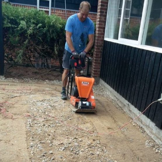 Bärlagret packas ordentligt 2. Bärlagret packas ordentligt med en markvibrator så att den nya plattbeläggningen inte ska sjunka ner. Kör fram och tillbaka ett par gånger över underlaget.