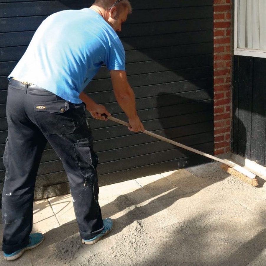 På den gamla stenbeläggningen under det nya, fina taket finns det många gropar, så det är svårt att få bord och stolar att stå stabilt. Därför tas de gamla plattorna upp och det görs ett nytt, stabilt underlag med fall bort från huset, som packas ordentligt med en markvibrator. Därefter läggs de gamla stenarna tillbaka.