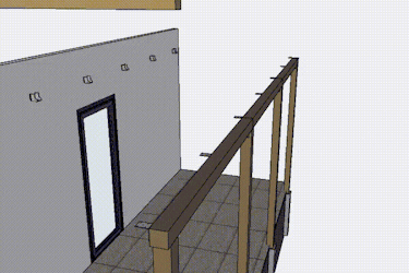 Taket består här av stolpar, fyra totalt, som placeras på ett avstånd av 2,4 m från huset. Överst på stolparna ska monteras en ram, som ska förankras i husets takfot med hjälp av spärrar. Det yttersta hammarbandet fästs först vid de yttersta stolparna, två och två, innan stolparna placeras i hål och förbinds i mitten.