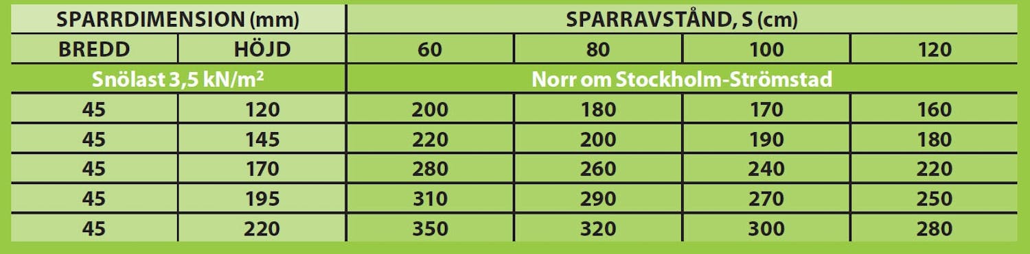 Tabellen gäller för lätta tak, exempelvis prof lerade skivor av plast eller plåt liksom brädor eller skivor klädda med takpapp. Dimensionerna, som avser konstruktionsvirke K24, har anpassats efter en snölast på 3,5 kN/m2 och avser flacka tak med en lutning under 14 grader.