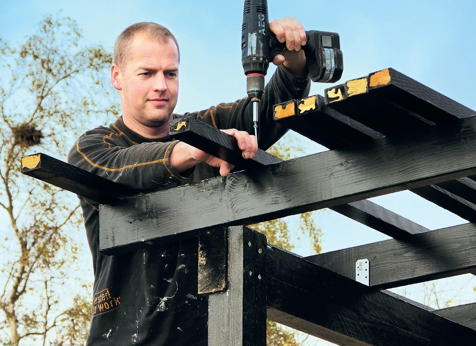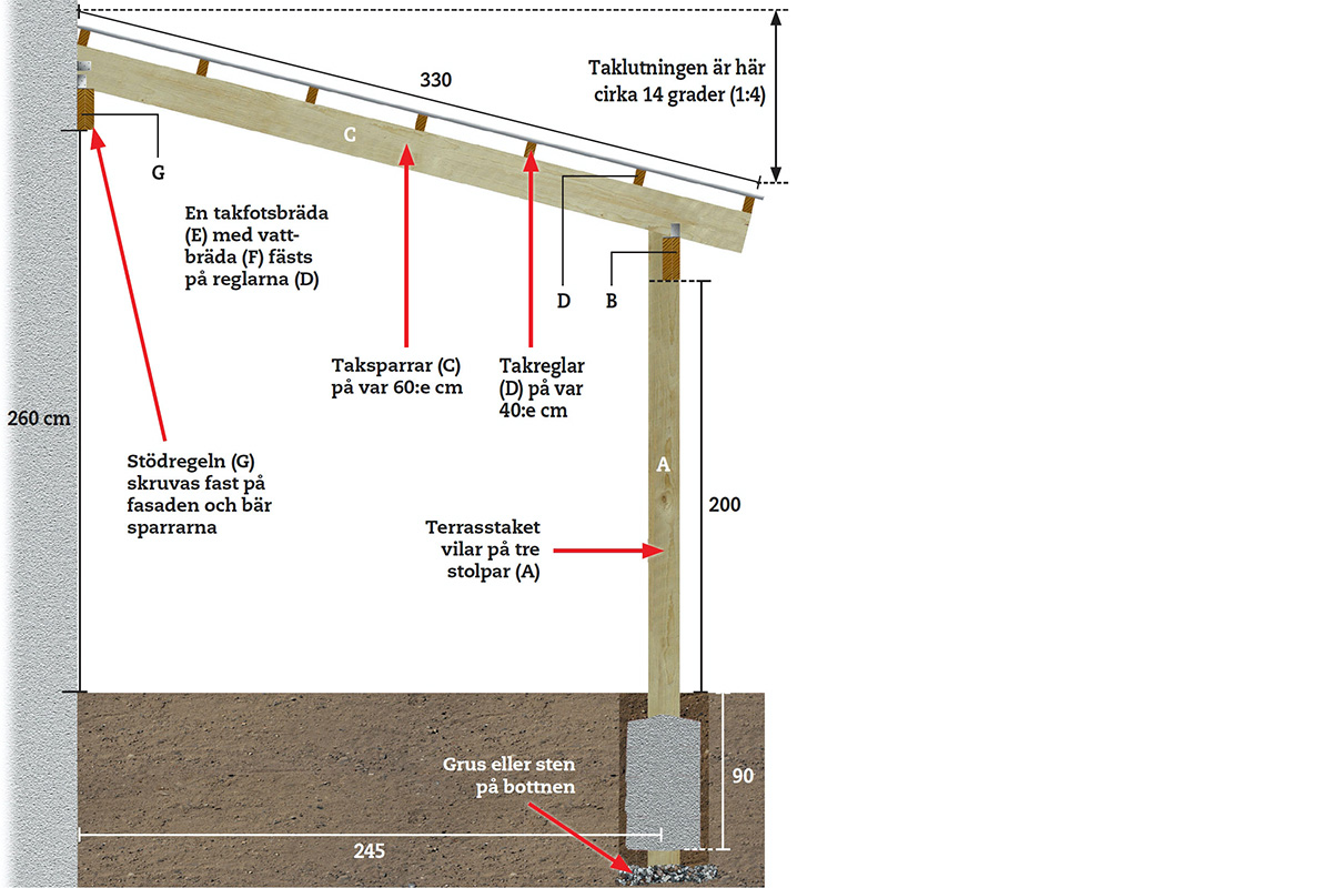 Här har vi grävt ner stolparna och satt dem i betongklumpar. Det ger fn stabilitet. Sparrarna fästs dessutom på en bärlina, som i sin tur monteras på fasaden. Om du inte gräver ner dina stolpar blir det nödvändigt att förstärka konstruktionen i sidled. Det gör du lättast med snedsträvor längst upp på stolparna. Den i mitten får snedsträvor åt båda sidorna medan de två yttre får en snedsträva mellan stolpe och överliggare.