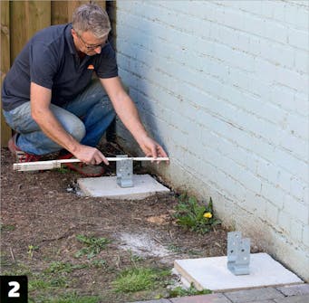 Sätt stolpskor i betongen när du har mätt upp för den exakta placeringen. Här är det 20 cm från väggen. Köp färdigblandad betong som bara ska blandas med vatten. Låt torka ett dygn innan du sätter i stolparna.