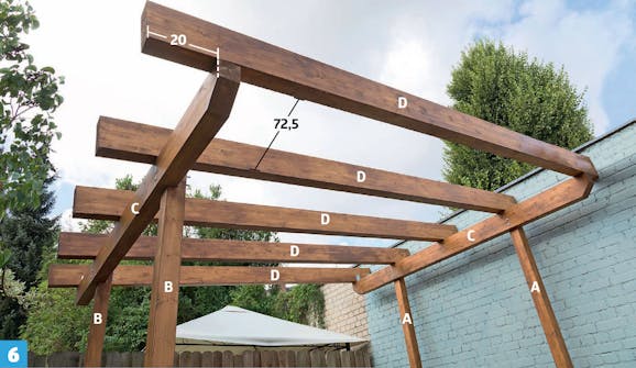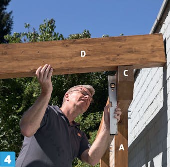 Sätt stolparna (A) i stolpskorna så att du kan mäta hur höga de ska vara, och såga ut ett hack till bärlinan (C). Om taket inte får vara högre än t ex en vägg måste du komma ihåg att ta hänsyn till det.