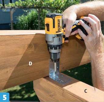 Spärrarna (D) skruvas fast med vinkelbeslag i bärlinorna (C). Här sätts spärrarna så att de sticker ut 30 cm över bärlinan vid väggen och 20 cm ut över bärlinan på den andra sidan.