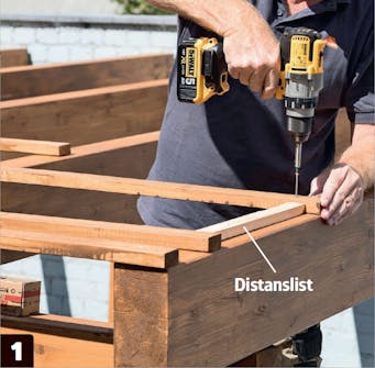 Terrassbrädorna (L) skruvas fast när de har sågats till. Vid änden placeras en rätski-va som bädorna läggs mot, så att de ligger på en rak linje. Använd distansklossar som ger samma avstånd mellan brädorna.