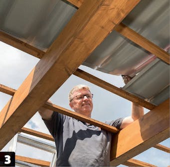 Fäst först bärlinan på den ena sidan - den där stolparna ska vara högre än de andra, så att du får fall på taket. Genom att provlägga en spärr på bärlinan kan du bestämma hur stort fall du vill ha. Här ska fallet vara 5 procent, vilket är ganska lite. Ovanpå bärlinorna läggs fem kraftiga spärrar. De fästs med vinkelbeslag både i bärlinorna och i väggen.