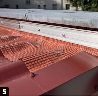 En flexibel taktäckning läggs i övergången mellan tak och vägg. Täckningen går ca 15 cm ut över taket och fästs med en aluminiumlist som skruvas fast i väggen.