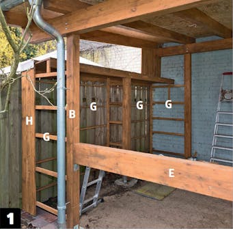 En trästomme byggs till inklädningen (H) på baksidan. Ribbor (G) sätts vågrätt i fem rader samt lodrätt i hörn och mitt på, och brädorna (H) sätts upp. En tvärslå (E) sätts upp mellan stolparna (B).