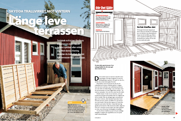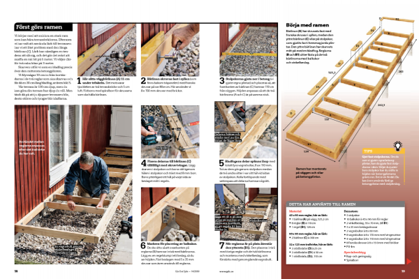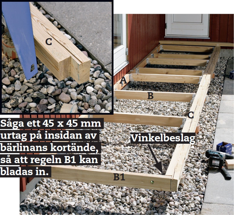 Vi börjar med att snickra en stark ram som kan bära terrassbrädorna. Eftersom vi har valt att använda lärk till terrassen har vi ett litet problem med den långa bärlinan (C). Lärk har nämligen en tendens att slå sig, och det gör det svårt att skaffa en rak bit på 6 meter. Vi väljer därför två raka bitar på 3 meter.