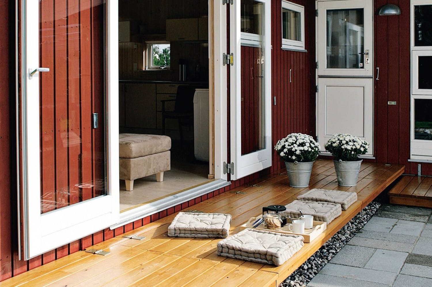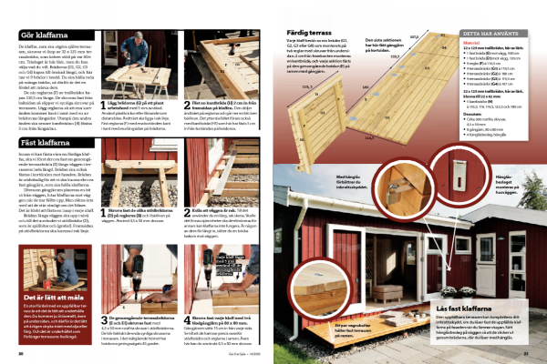 Vår terrass är 130 cm djup, men du kan göra din terrass hur djup du vill. Men tänk då på att ju djupare terrassen blir, desto större och tyngre blir klaffarna.