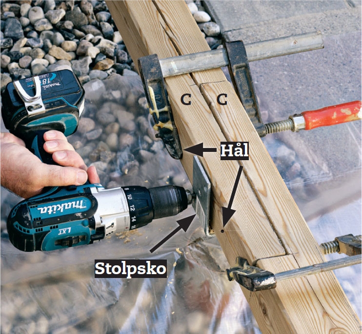 Fixera delarna till bärlinan (C) tillfälligt med skruvtvingar. Lägg skarven i stolpskon och borra rätt igenom hålen i stolpskon och träet med 8 mm borr. Borra ytterligare ett hål på varje sida av beslaget mitt i regeln.
