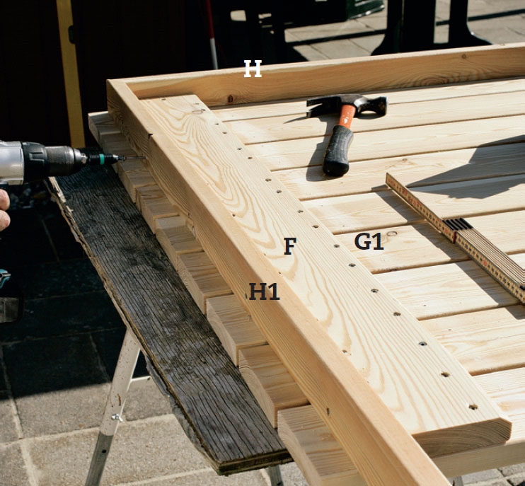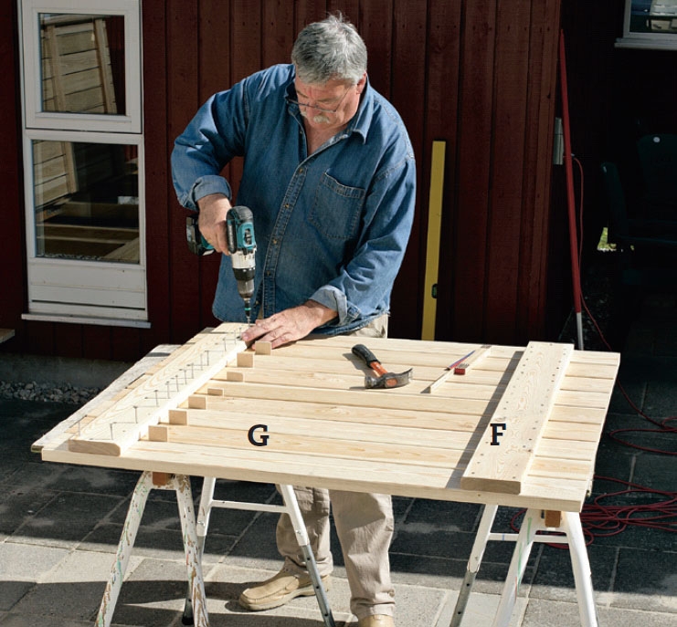 Lägg brädorna (G) på ett plant arbetsbord med 5 mm avstånd. Använd plastbrickor eller liknande som distansbitar. Ändträet ska ligga i rak linje. Fäst reglarna (F) med ena kortänden kant i kant med ena långsidan på brädorna.