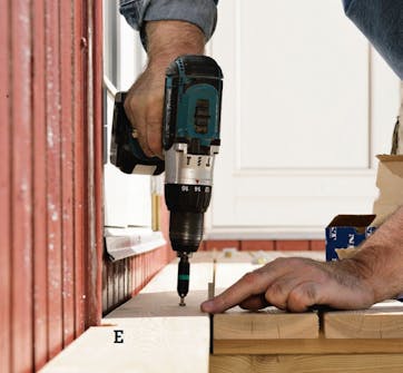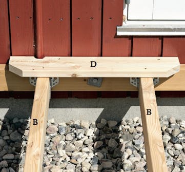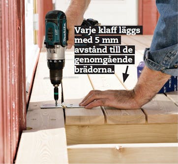 Här sätts väggbärlinan (A) 11 cm under tröskeln. Det motsvarar tjockleken av två terrassbrädor och 5 cm luft. Förborra med spiralborr för skruvarna som ska hålla bärlinan.