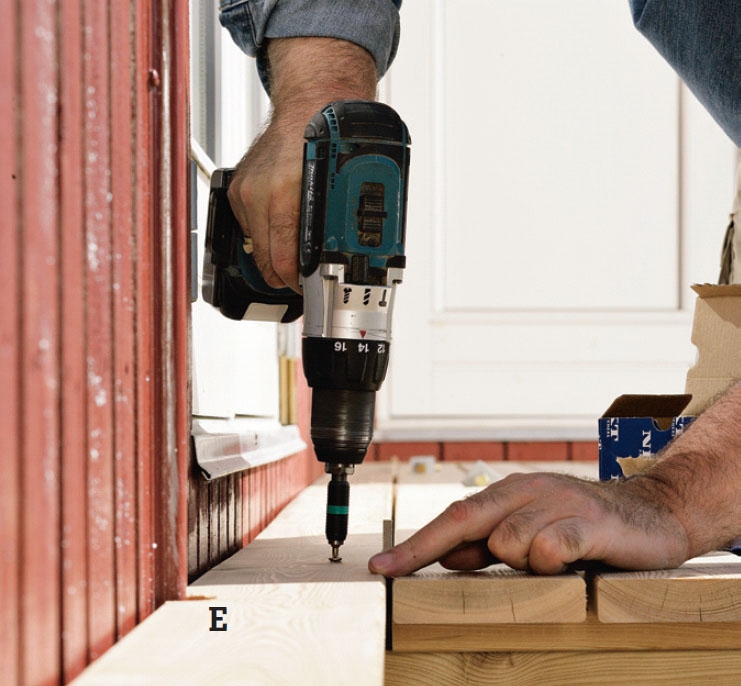 De genomgående terrassbrädorna (E och E1) skruvas fast med 4,5 x 50 mm rostfria skruvar i stödbrädorna. De blir faktiskt de enda synliga skruvarna i terrassen. I det inåtgående hörnet har brädorna geringssågats 45 grader.