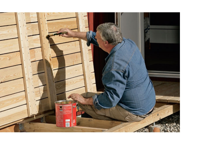 De klaffar, som ska utgöra själva terrassen, skruvar vi ihop av 32 x 125 mm terrassbrädor, som kräver stöd på var 60:e cm. Träslaget är här lärk, men du kan välja vad du vill. Brädorna (G1, G2, G3 och G4) kapas till önskad längd, och här har vi 9 brädor i bredd. Du ska hålla reda på många brädor, så därför är det en fördel att märka dem De nio reglarna (F) av trallbrädor kapas 110,5 cm långa.