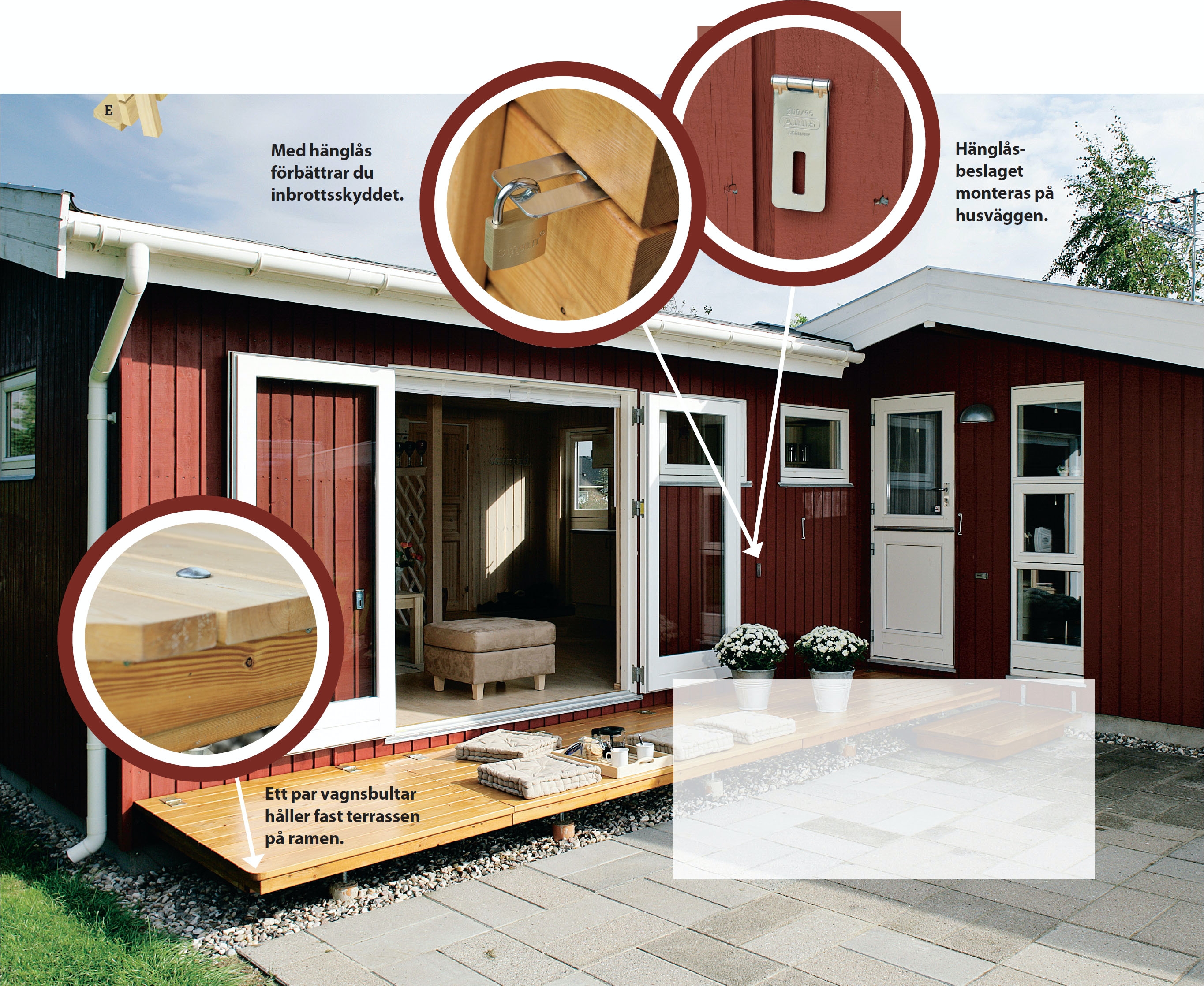 Innan vi kan fästa våra nu färdiga klaffar, ska vi först skruva fast en genomgående terrassbräda (E) längs väggen i terrassens hela längd. Brädan ska också fästas i kortänden mot fasaden. Brädan är nödvändig för att vi ska kunna skruva fast gångjärn, som ska hålla klaffarna.