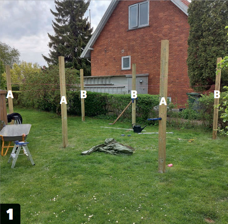 Stolparna (A och B) ställs i marken i betong. Hålen görs med markborr och är 90 cm djupa. Fyll på betong runt stolparna när de är i lod. Stolparna ska stå i en rak linje - använd murarsnöre om det behövs.
