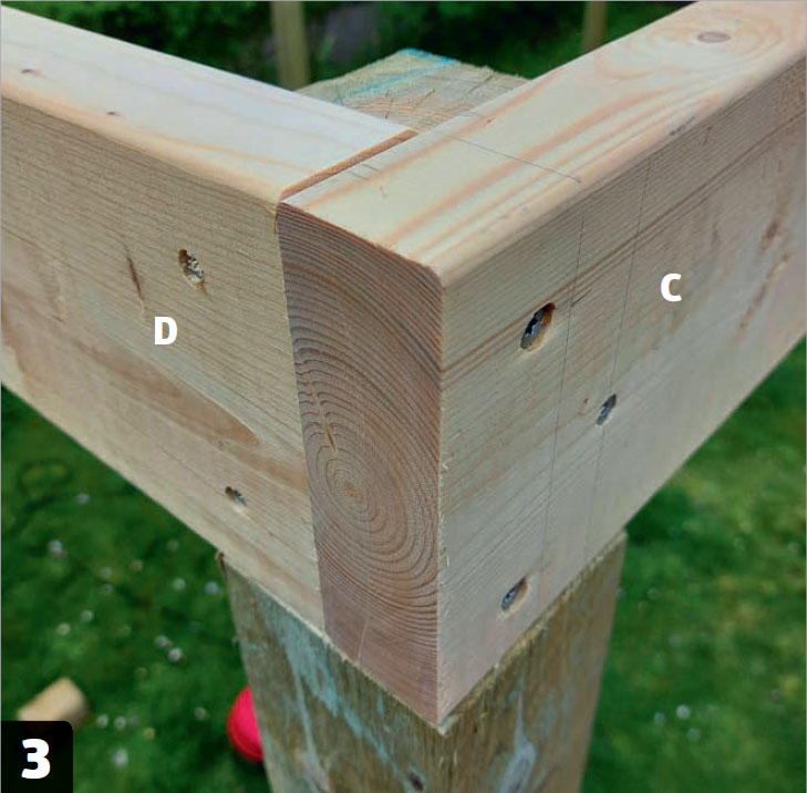 Hack sågas ut överst på stolparna (A och B). I hörnstolparna sågar du ut två hack med såg och multiverktyg så att både yttre sparrarna (D) och bärlinorna (C) ligger i nivå med stolparnas utsida.