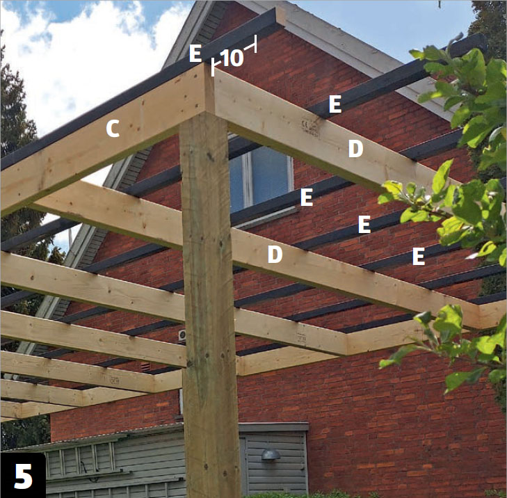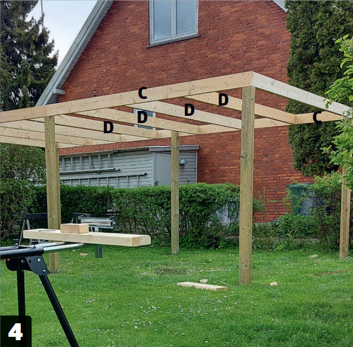Fäst bärlinorna (C) och den yttre sparren (D). Sparrarna kapas med avfasade snitt så att de passar mellan bärlinorna. Sparrarna fästs i bärlinorna med 120 mm skruv. De yttersta sparrarna fästs även i stolparna.