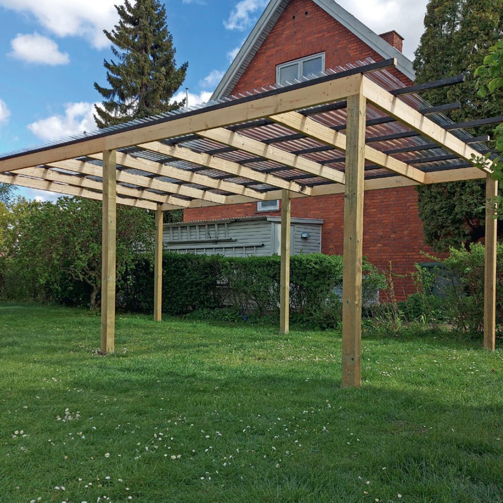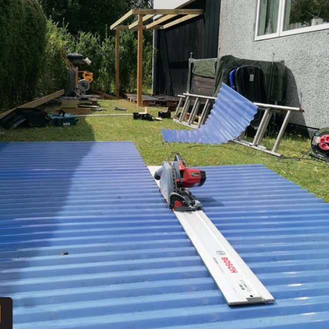 Som tak på överbyggnaden väljer vi korrugerade plastskivor som ger gott om ljus och en känsla av att sitta under bar himmel.