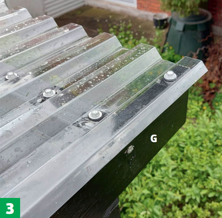 Vindskivan (G) sätts vid änden på läkten (E), så att den sitter skyddad under den yttre delen av taket. Takskivans ytterkant fästs med några skruvar i vindskivan så att den inte skramlar när det blåser.