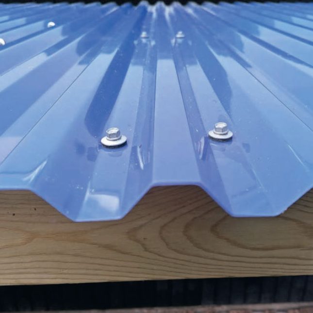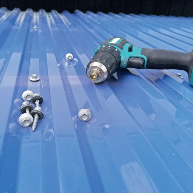 De klara plastskivorna läggs på taket. Det är viktigt att skivorna läggs med en överlappning på två ”toppar”. Skivorna fästs med skruvar för korrugerade skivor, som har en packning under skruvhuvudet som sluter tätt mot taket.