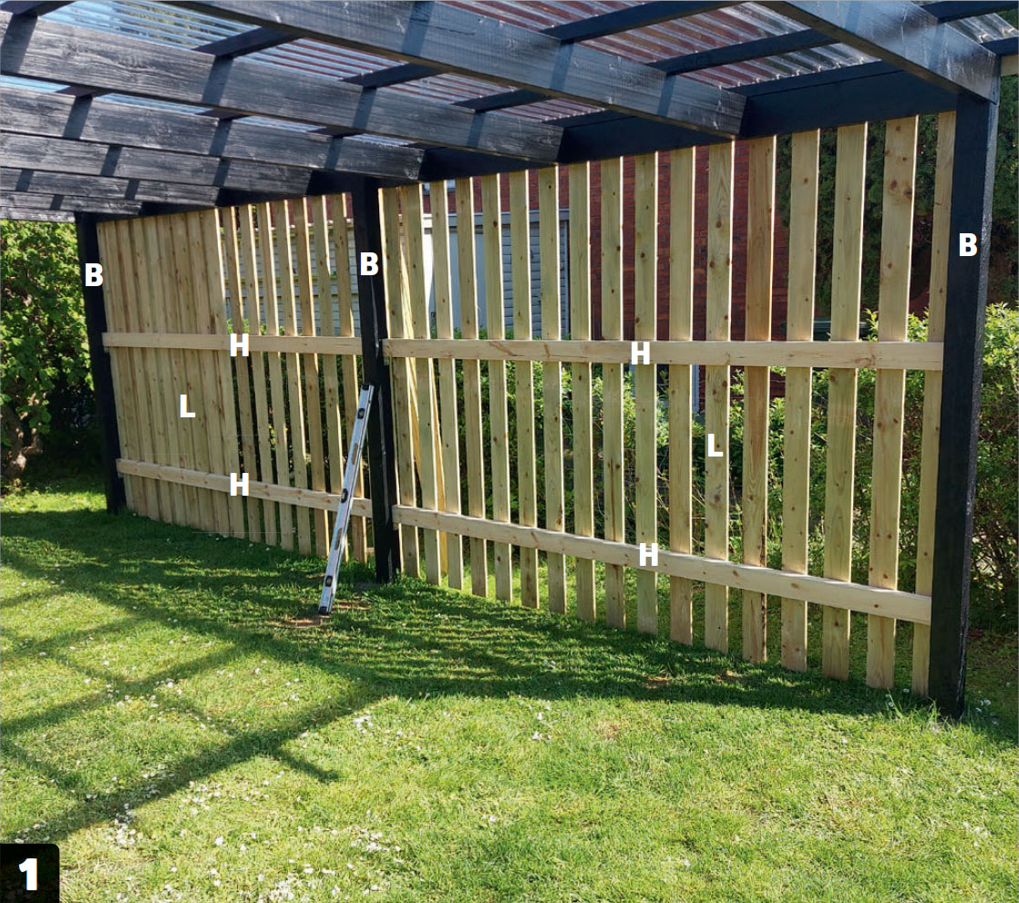 Sätt först fyra tvärslåar (H) så att du har något att skruva fast de stående panelbrädorna (L) i. Fäst de tvärgående reglarna med vinkelbeslag och skruv i stolparna (B). Sätt det inre ”lagret” med panelbrädor på ett avstånd av 6 cm.