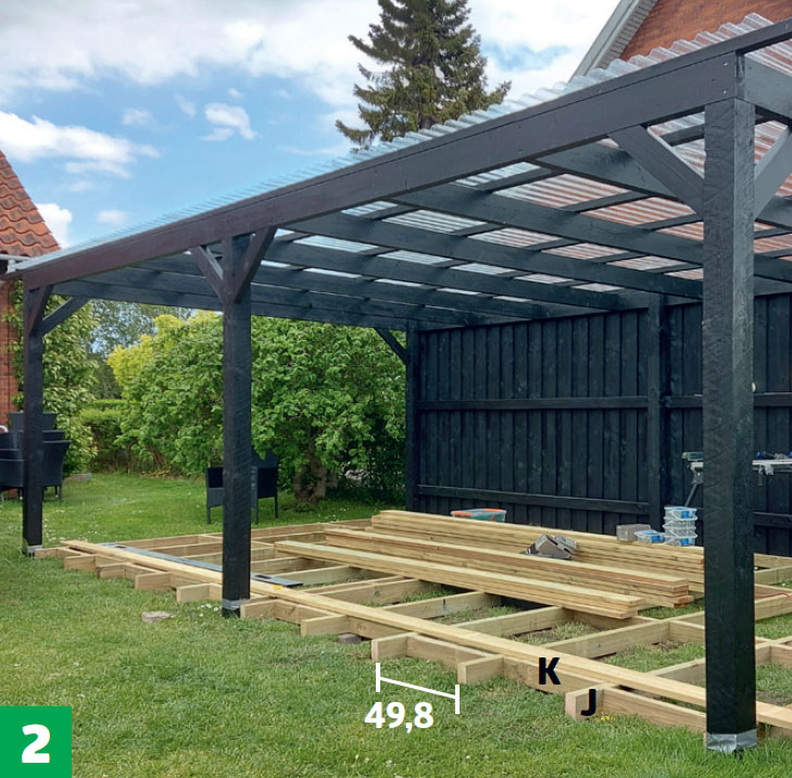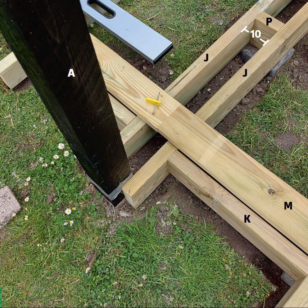 Bygg den bärande konstruktionen till trädäcket. Där reglarna (J) möter stolparna (A och B) fästs de med 120 mm skruvar. Förborra för skruvarna så att reglarna inte spricker. Vid mittstolpen (A) fäster du en regel på varje sida, eftersom trallbrädorna (M) ska skarvas här. Sätt kortlingar (P) emellan.