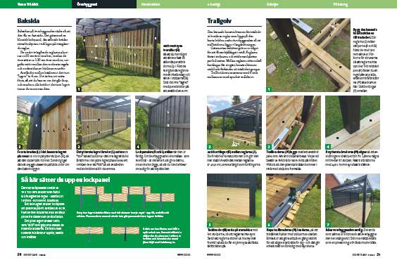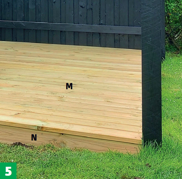 Kapa trallbrädorna (M) i ändarna, så att trädäcket fluktar med stolparnas utsidan. Enklast är att göra allt på en gång istället för att såga varje bräda för sig - och det går enkelt med en sänksåg med styrskena.