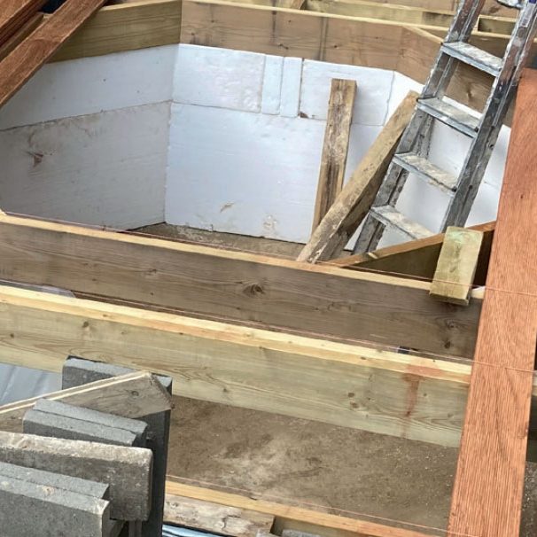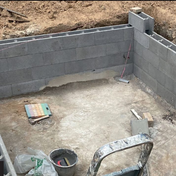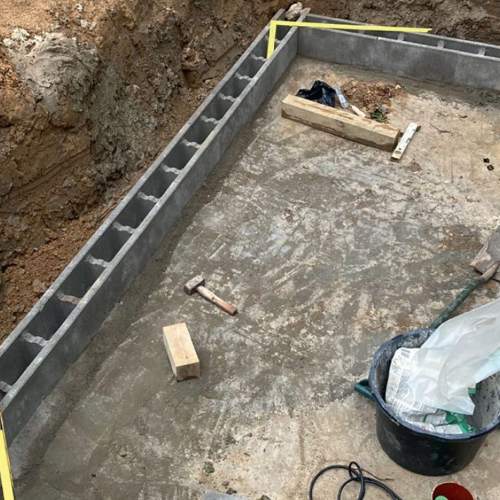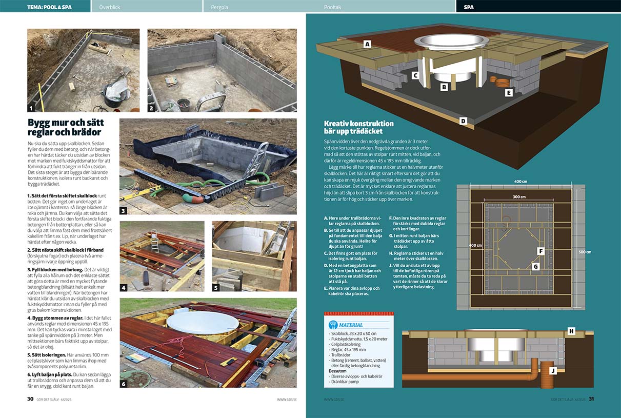 Nu ska du sätta upp skalblocken. Sedan fyller du dem med betong, och när betongen har härdat täcker du utsidan av blocken mot marken med fuktskyddsmattor för att förhindra att fukt tränger in från utsidan. Det sista steget är att bygga den bärande konstruktionen, isolera runt badkaret och bygga trädäcket.