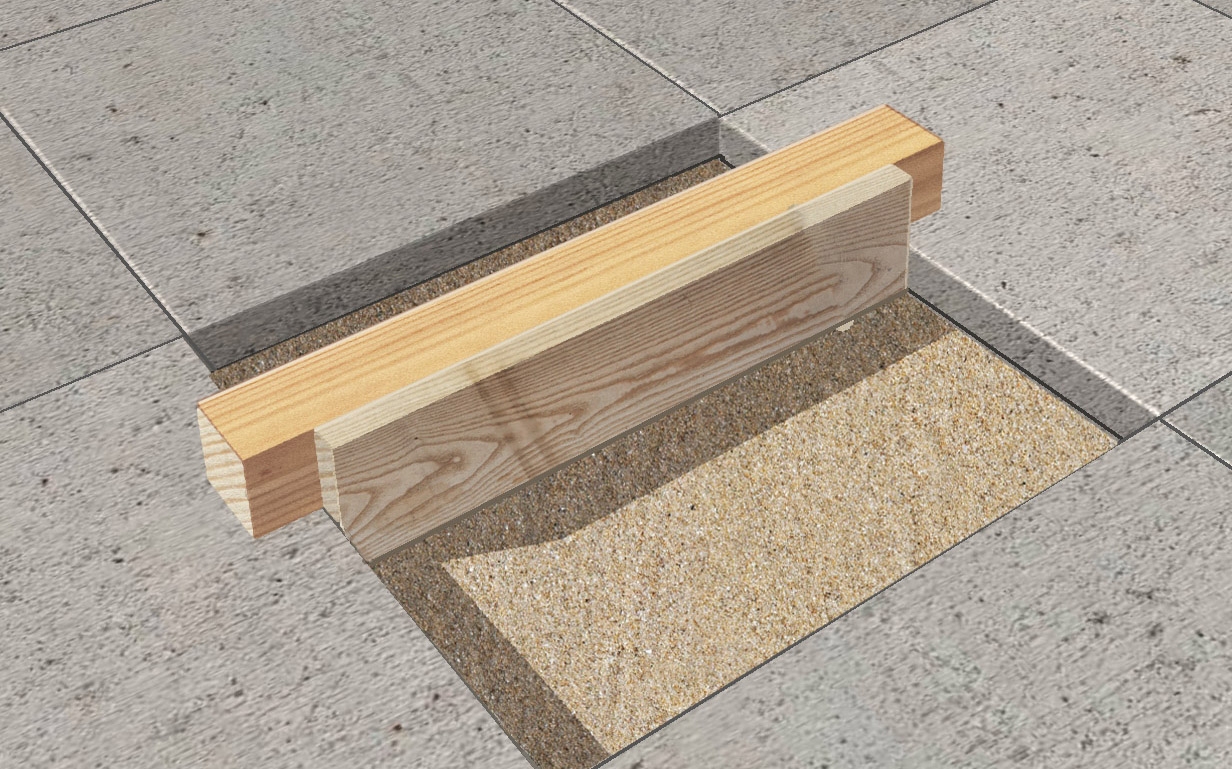 Det gör du genom att först tillverka ett litet hjälpredskap. Leta reda på en regel som är så lång att den kan ligga över hålet efter plattan. Fäst sedan en list på regeln. Listen ska kunna gå ner i hålet och vara så tjock att den når ner till 5 mm ovanför botten av hålet. När du tagit bort plattan och rensat hålet fyller du på sand och jämnar av med redskapet så att du får en plan yta. Lägg ner den nya stenplattan, borsta ner sand i fogarna och knacka fast den.