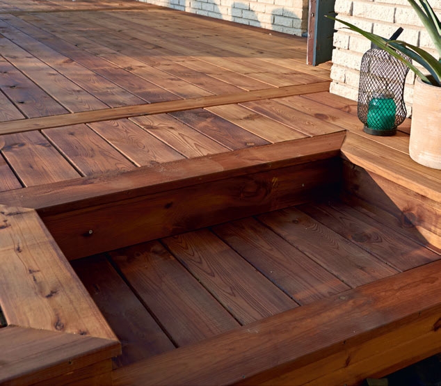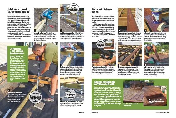 Vår terrass är stor så vi gör den ännu mer personlig genom att lägga till några snygga detaljer. I vägledningen har vi behandlat de lodräta brädorna som delar in terrassen i fält. Det ger en snygg effekt när den annars helt vågräta ytan bryts.