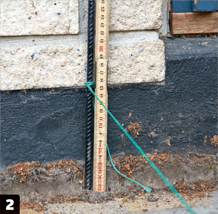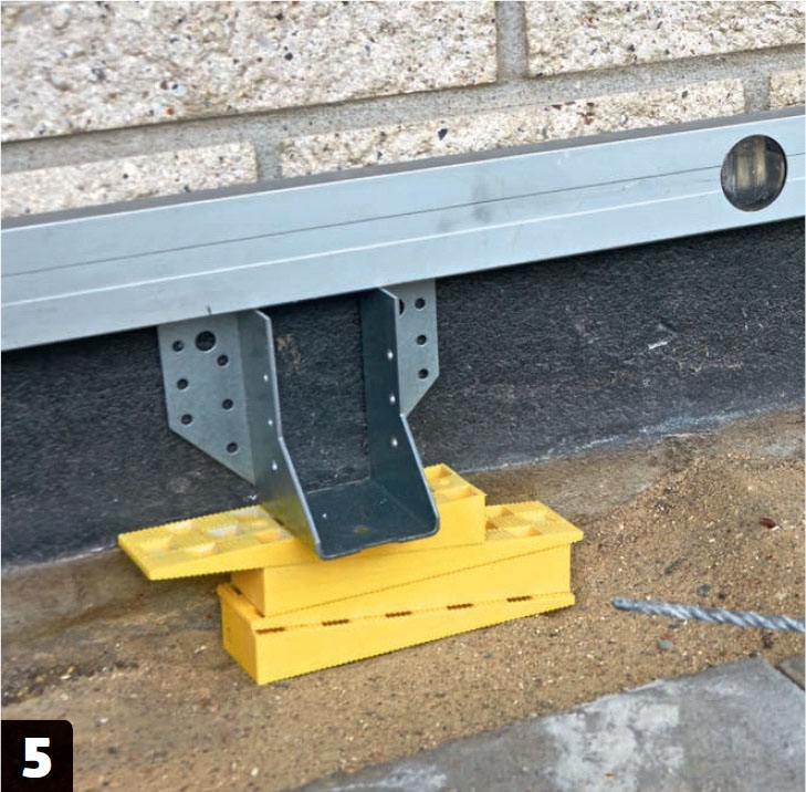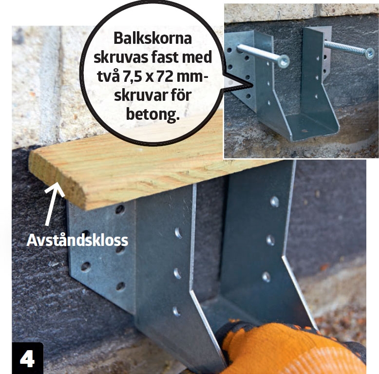 Vi använder en 0,5 cm tjock avståndskloss för att säkerställa att balkskorna monteras i rätt höjd på sockeln. De monteras med betongskruvar och vi förborrar med ett 6 mm-betongborr.